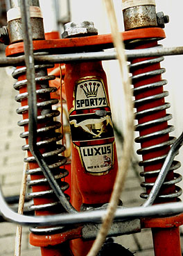 Ein recht transportfähiges Bonanzarad mit einigen interessanten Besonderheiten: * Hohe Sissybar * Keine Schaltung * 20" x 2.125 - Bereifung * Kettenschutz "Super de luxe" * Extras: Plattfuß vorne und hinten, Gepäckträger vorne und hinten (Fahrer dürfen sich den Ehrentitel "Paletten" vor ihren Kampfnamen setzen) |